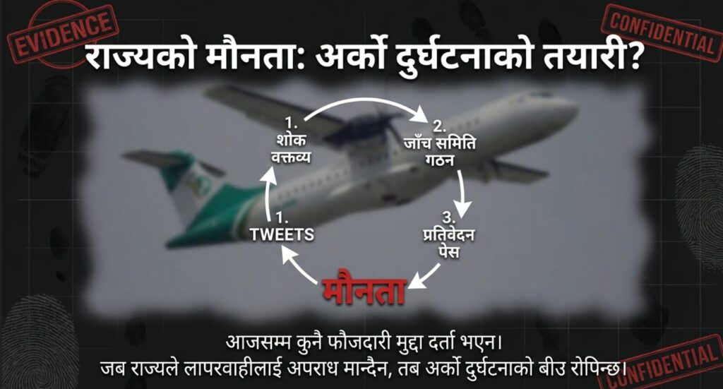 कि संस्थागत बेवास्ताको परिणाम ? जब राज्यले लापरबाहीलाई अपराधको रूपमा लिँदैन, तब अर्को दुर्घटनाको बीउ त्यहीँ रोपिन्छ । नेपालको आकाशमा विमानहरू अझै उडिरहेका छन् ।