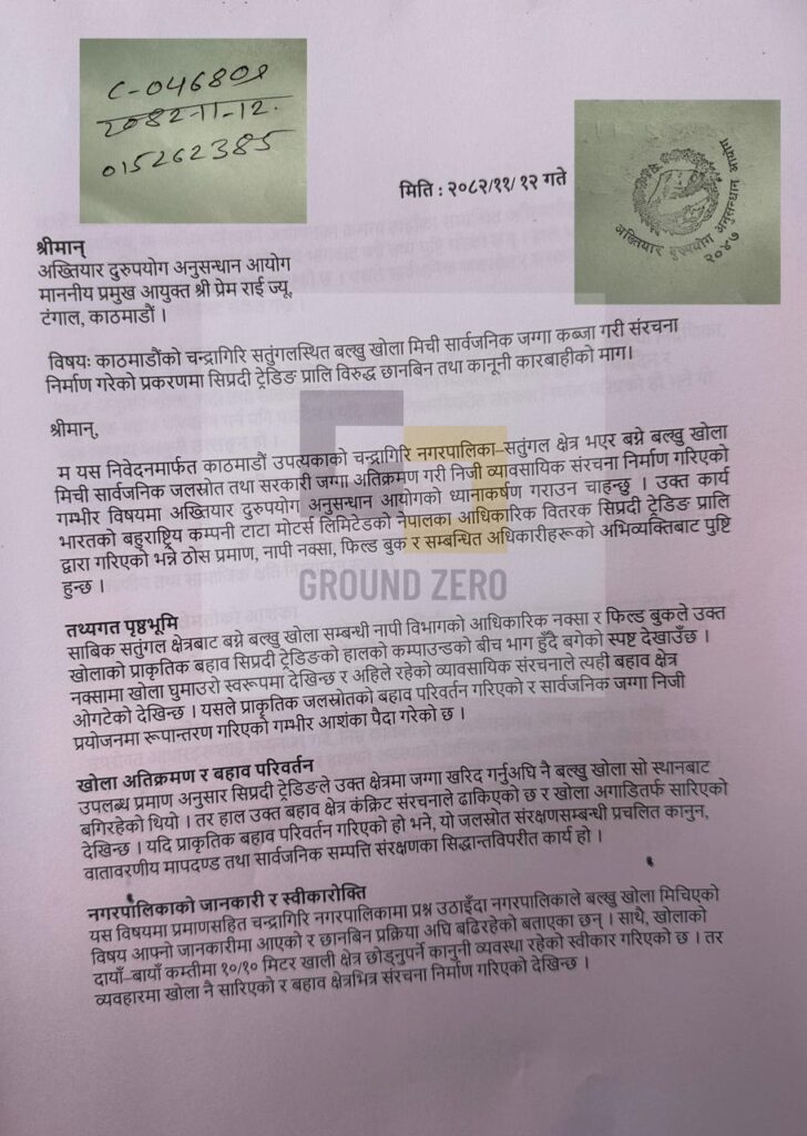 काठमाडौं उपत्यकाको चन्द्रागिरि नगरपालिका–सतुंगल क्षेत्र । यो ठाउँबाट बग्ने बल्खु खोला कुनै समय प्राकृतिक घुमाउरो बहावसहित साबिक नक्सामा स्पष्ट देखिन्थ्यो । तर, आज त्यही क्षेत्रमा कंक्रिट संरचना उभिएका छन् । खोला कहाँ गयो ? कसरी हरायो ? र कसको स्वार्थका लागि सारियो ? ग्राउण्ड जिरोले सार्वजनिक गरेको खोजमूलक स्टोरीपछि अन्ततः यो विषय औपचारिक रूपमा अख्तियार दुरुपयोग अनुसन्धान आयोगसम्म पुगेको छ ।