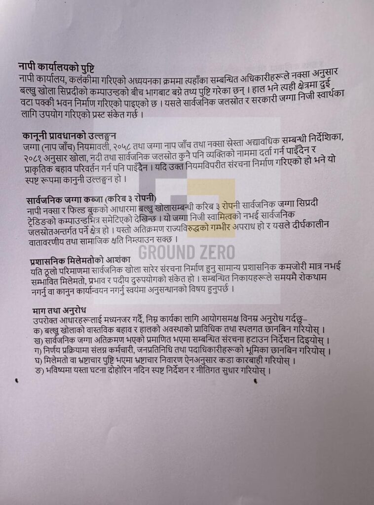 उजुरीमा उल्लेख छ—बल्खु खोला सम्बन्धी करिब ३ रोपनी सार्वजनिक जग्गा सिप्रदीको कम्पाउन्डभित्र परेको देखिन्छ । ३ रोपनी सानो क्षेत्र होइन ।