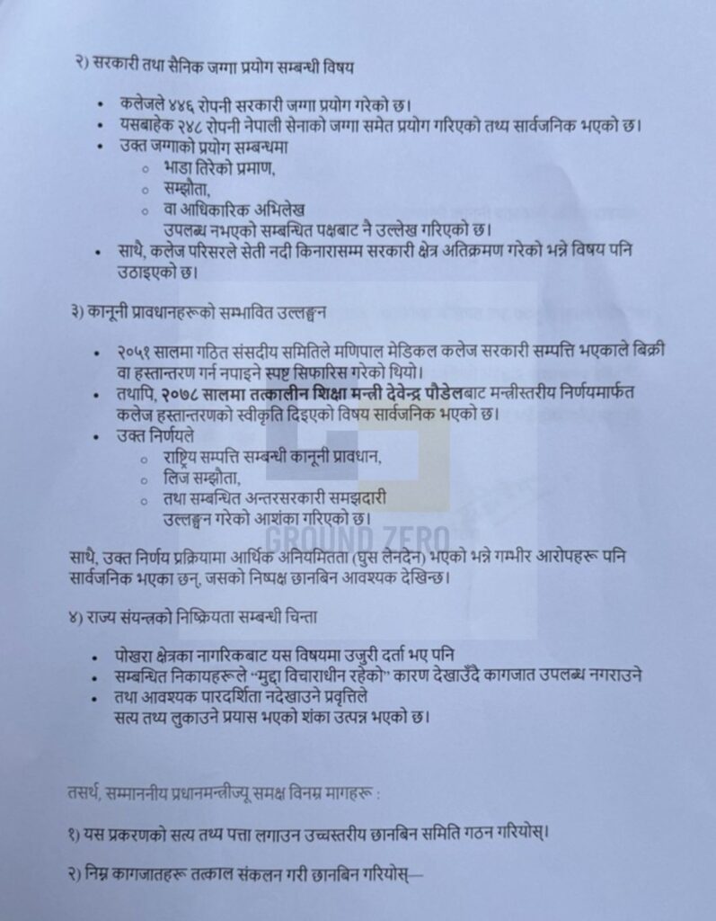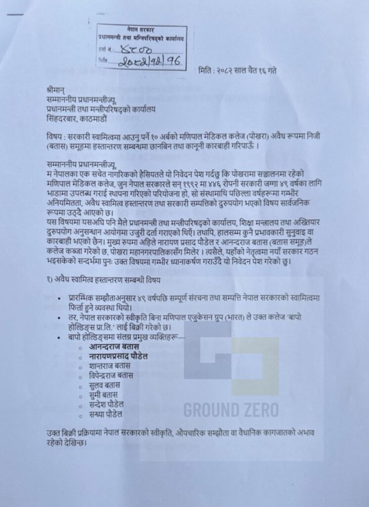 चैत १६, २०८२ मा प्रधानमन्त्री तथा मन्त्रिपरिषद्को कार्यालय र शिक्षा, विज्ञान तथा प्रविधि मन्त्रालयमा दर्ता गरिएको उक्त उजुरीमा १० अर्ब रुपैयाँ बराबरको मणिपाल मेडिकल कलेज सरकारी स्वामित्वमा आउनुपर्ने भए पनि अवैध रूपमा बतास समूहमा हस्तान्तरण गरिएको छ ।