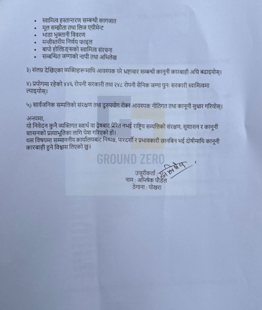 • सरकारी सम्पत्तिको संरक्षणसम्बन्धी कानुन विपरीत भएको भन्ने आशंका व्यक्त गरिएको छ । त्यस्तै, उक्त निर्णय प्रक्रियामा आर्थिक अनियमितताको सम्भावनाबारे पनि छानबिन माग गरिएको छ।